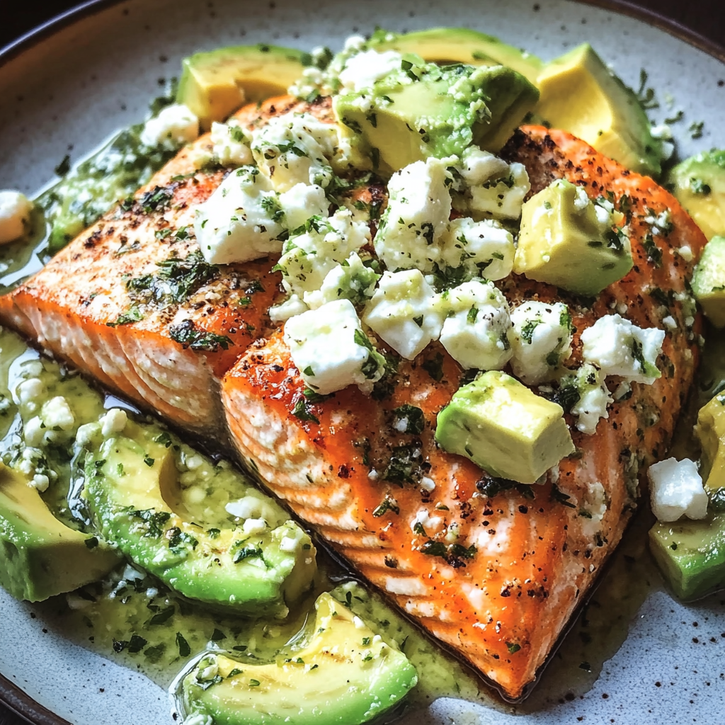- 5️⃣ Serve: Spoon the avocado-feta topping over the baked salmon. Garnish with extra dill or lemon zest.