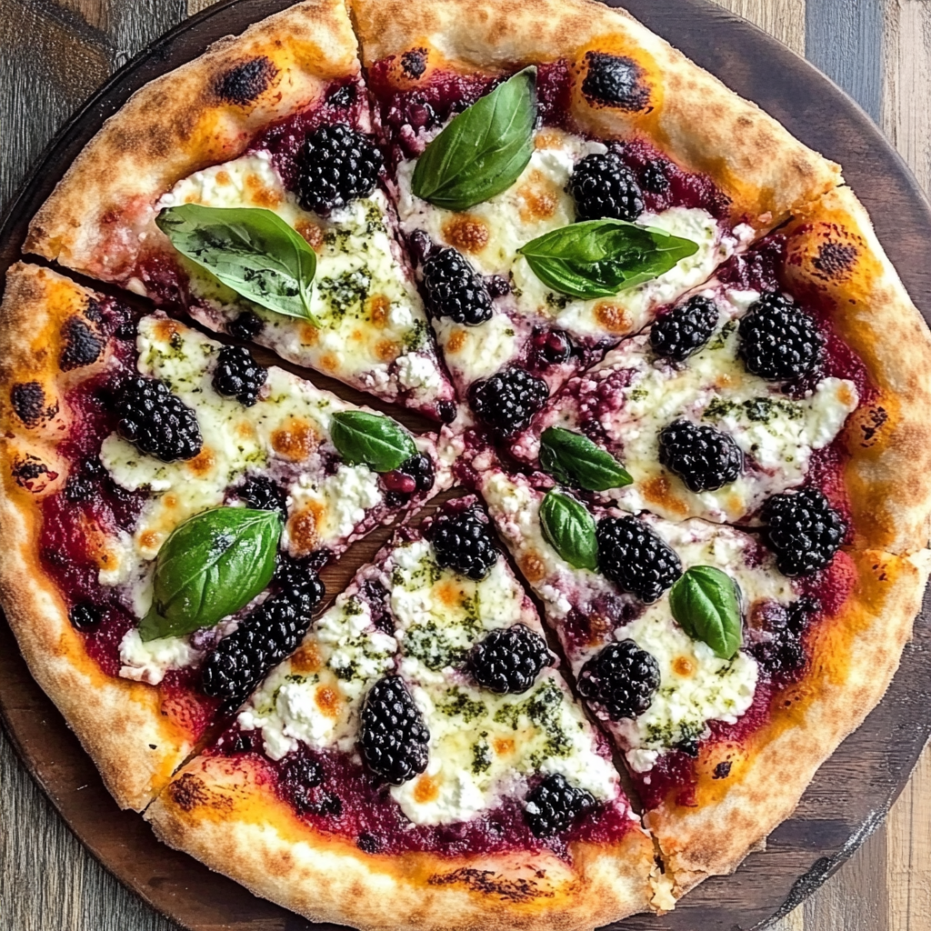 A sweet and savory gourmet pizza featuring fresh blackberries, creamy ricotta, and basil, perfect for summer dinners and gatherings.