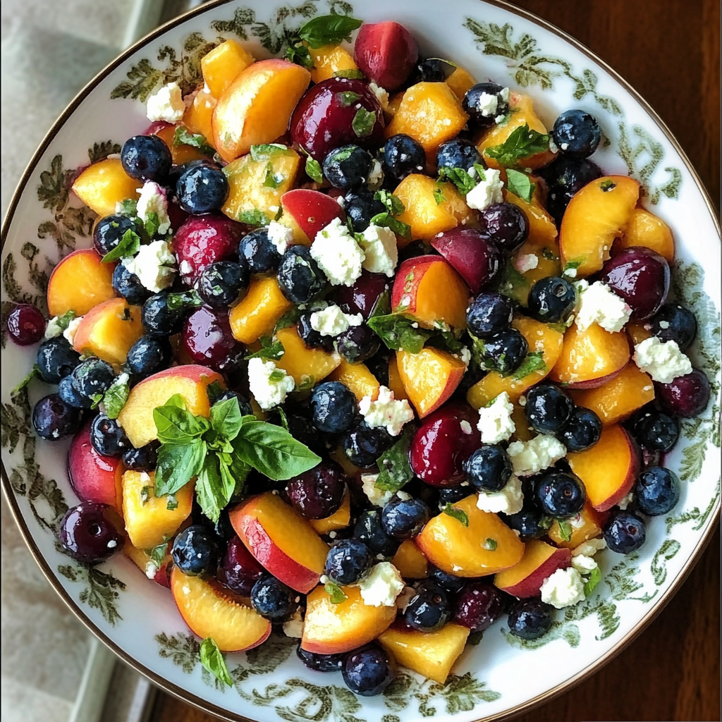 | A vibrant, sweet-and-savory summer salad featuring fresh blueberries, peaches, and feta cheese tossed in a lemon basil vinaigrette. |