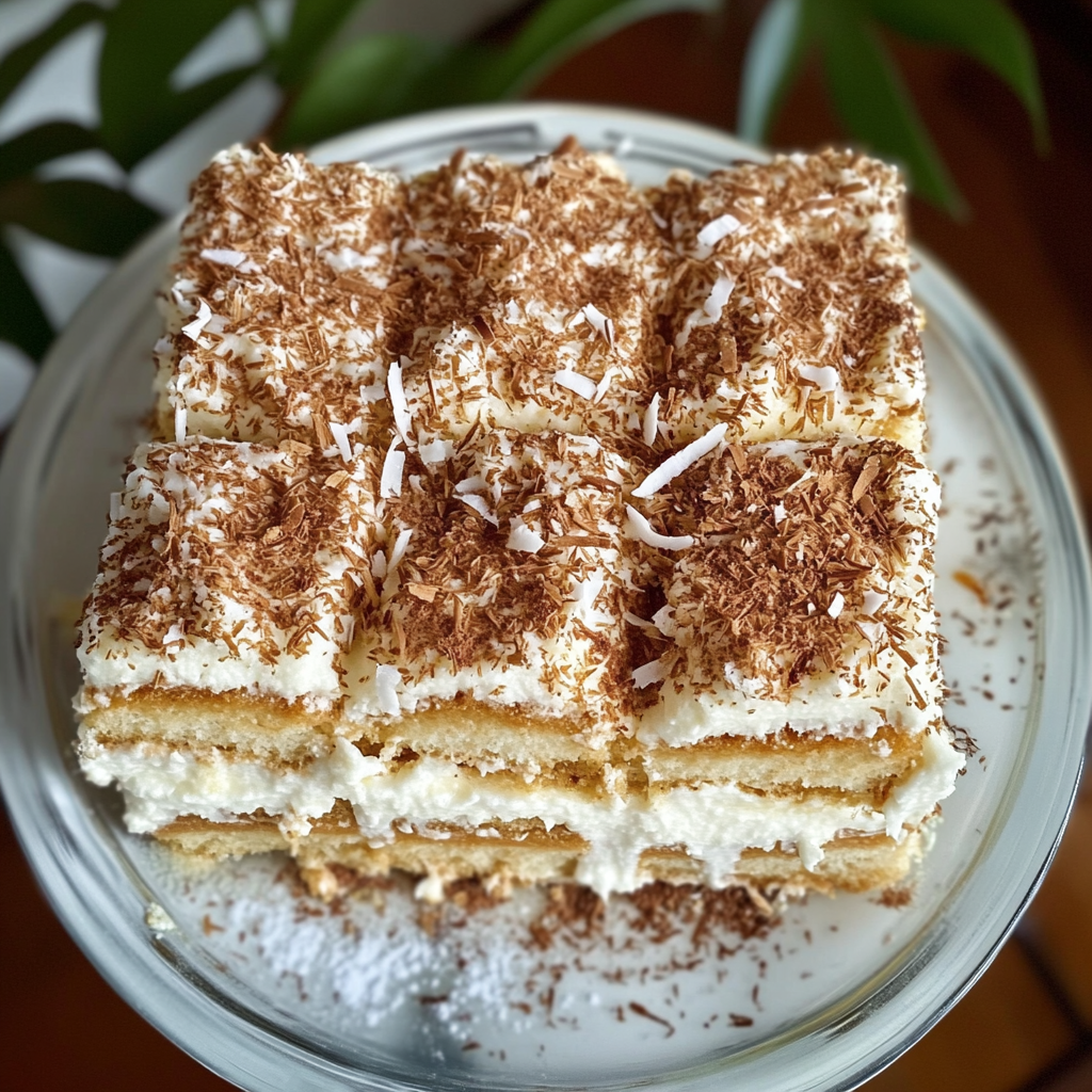 A tropical twist on the classic Italian dessert, Coconut Rum Tiramisu features layers of espresso-soaked ladyfingers, coconut rum-infused mascarpone cream, and toasted coconut. No baking required — just chill and enjoy!