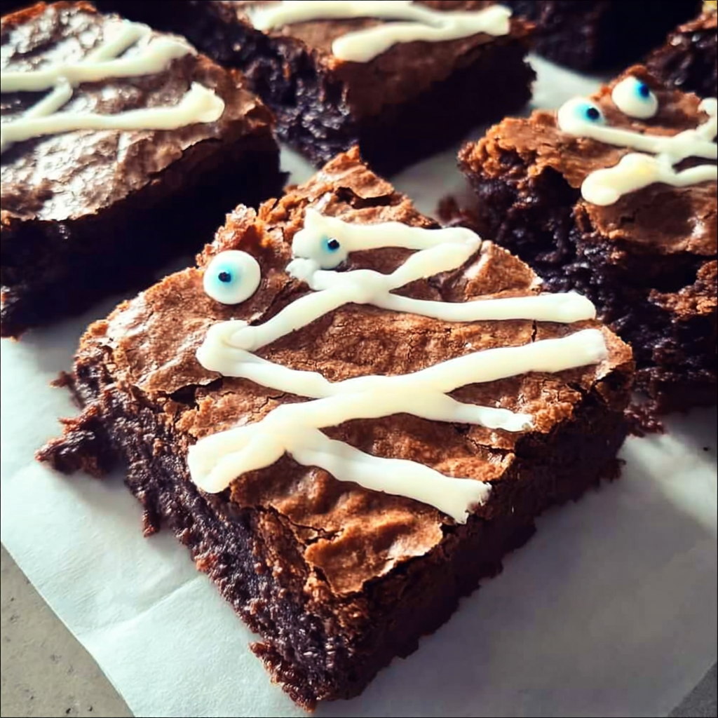 Mummy Brownies are brownies decorated to resemble mummies. The effect is achieved by:
