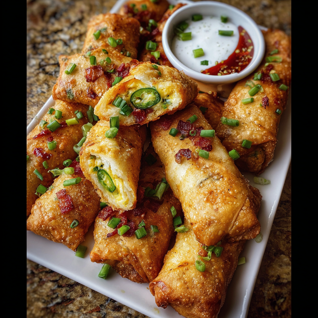 | Crispy egg rolls filled with a creamy mixture of cream cheese, sharp cheddar, bacon, and jalapeno peppers. A crowd-pleasing appetizer perfect for fall gatherings, game days, or parties. |