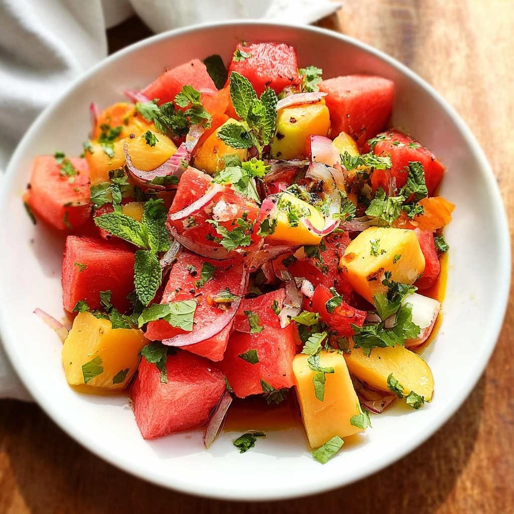 A refreshing summer fruit salad made with juicy watermelon, ripe peaches, fresh herbs, creamy feta, and a zesty honey-lime dressing. Perfect for BBQs, picnics, or a light meal.