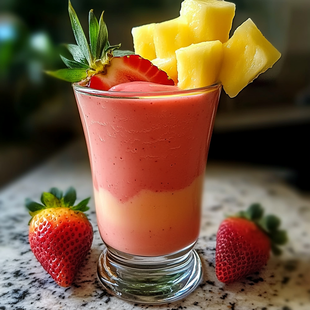 A tropical, refreshing drink made with strawberries, pineapple, and coconut milk. Perfect for a quick breakfast, snack, or a cool summer treat.