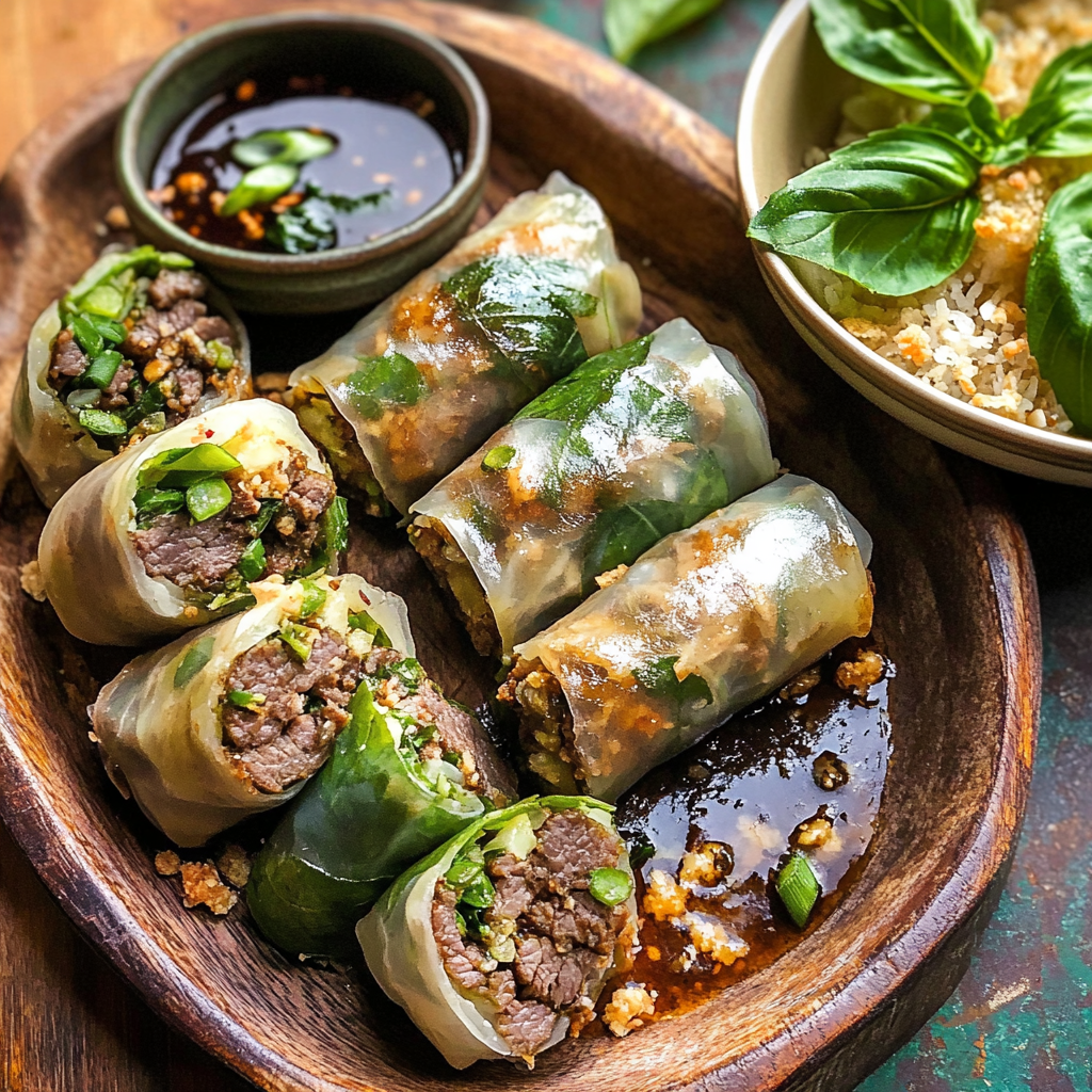 The magic of Thai Basil Beef Rolls lies in their perfectly balanced flavor profile. Each bite delivers a harmony of sweet, spicy, salty, and tangy notes that are signature to Thai cuisine. The savory depth of soy sauce-simmered beef is lifted by the peppery freshness of Thai basil and the brightness of lime or vinegar-based sauces. Thai chili sauce or paste adds a gentle heat that lingers without overpowering. Fresh herbs and crisp cucumbers bring contrast and coolness, while roasted peanuts offer nutty crunch. It’s a dish that hits every taste bud—layered, complex, and endlessly craveable.